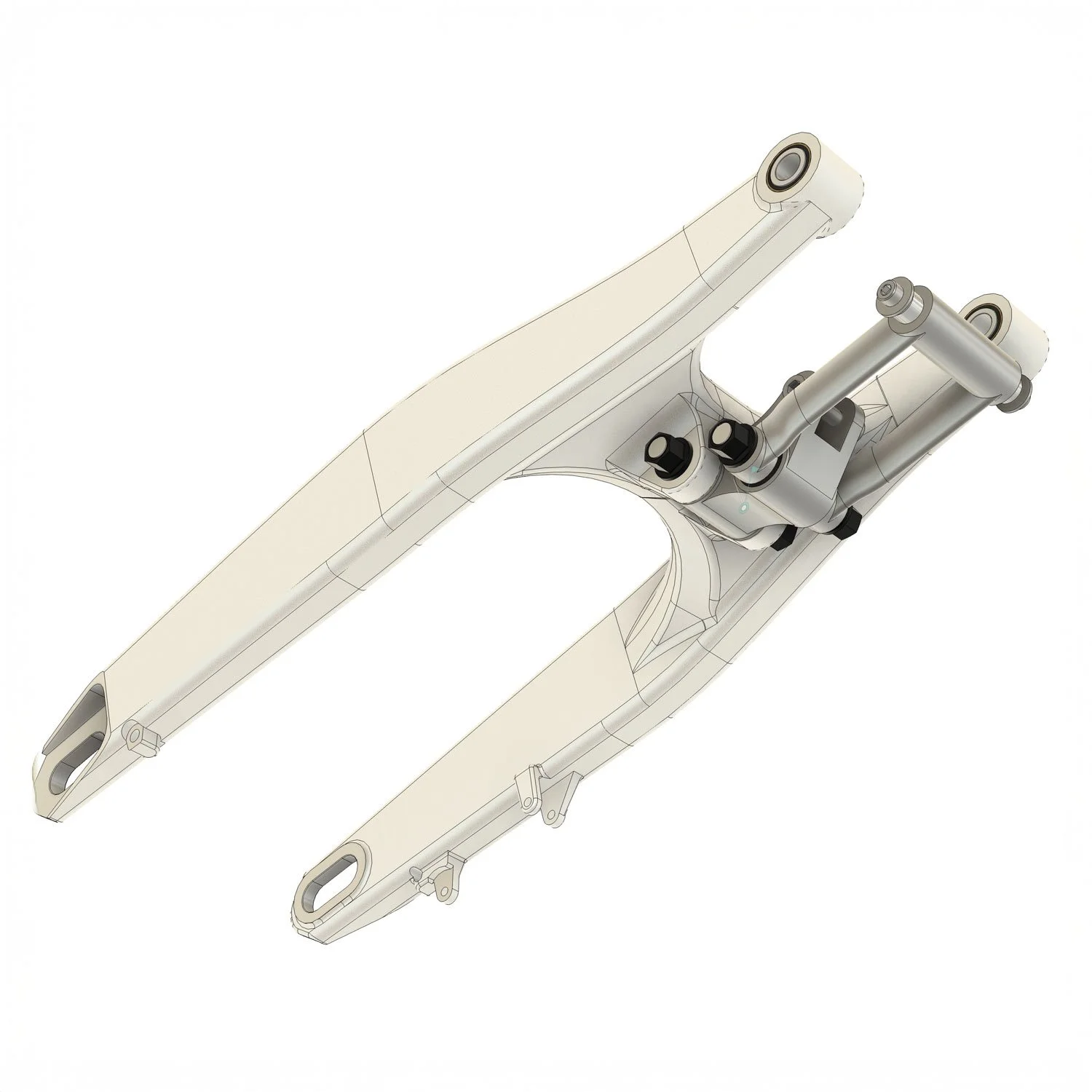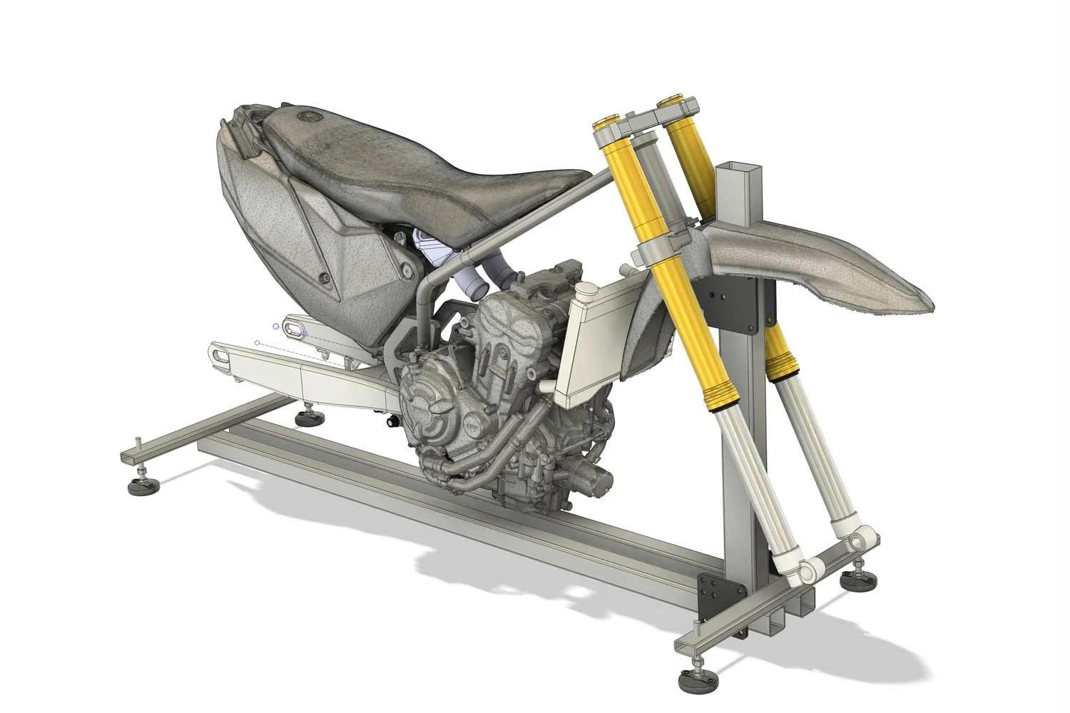 As with other components, the swing-arm and shock were carefully measured and modeled in Fusion 360 to ensure accurate fitment and integration into the project. A simple fixture was built to find the centerline and chain path of the KTM swing-arm.