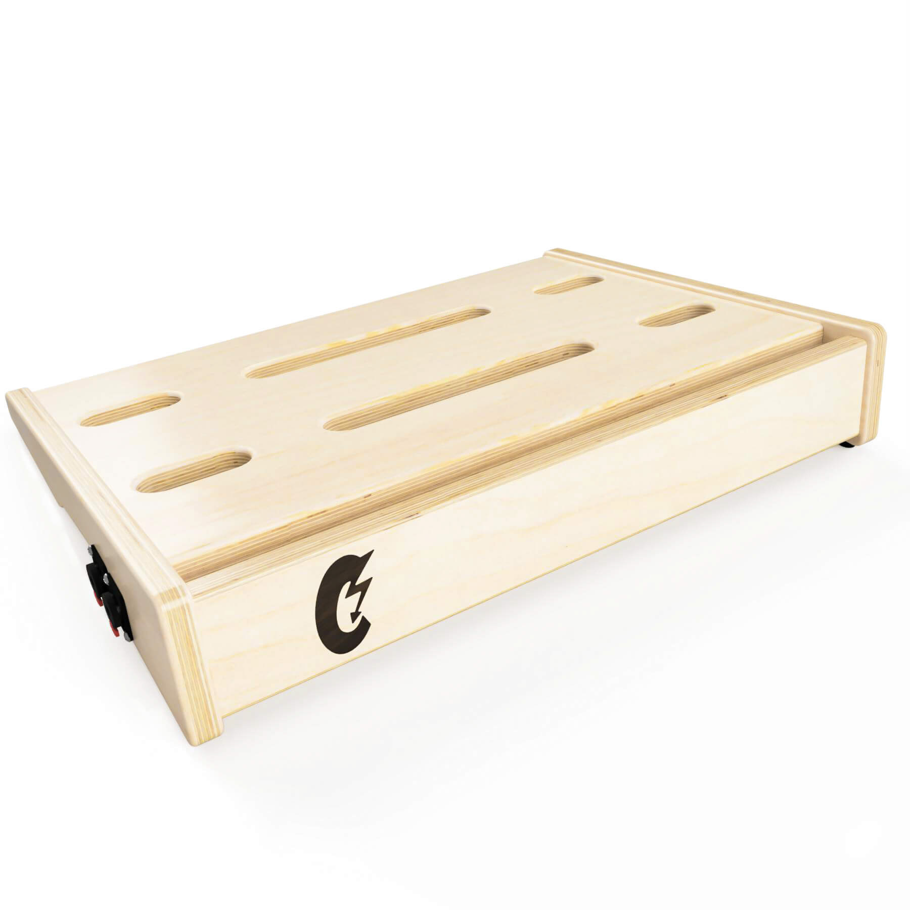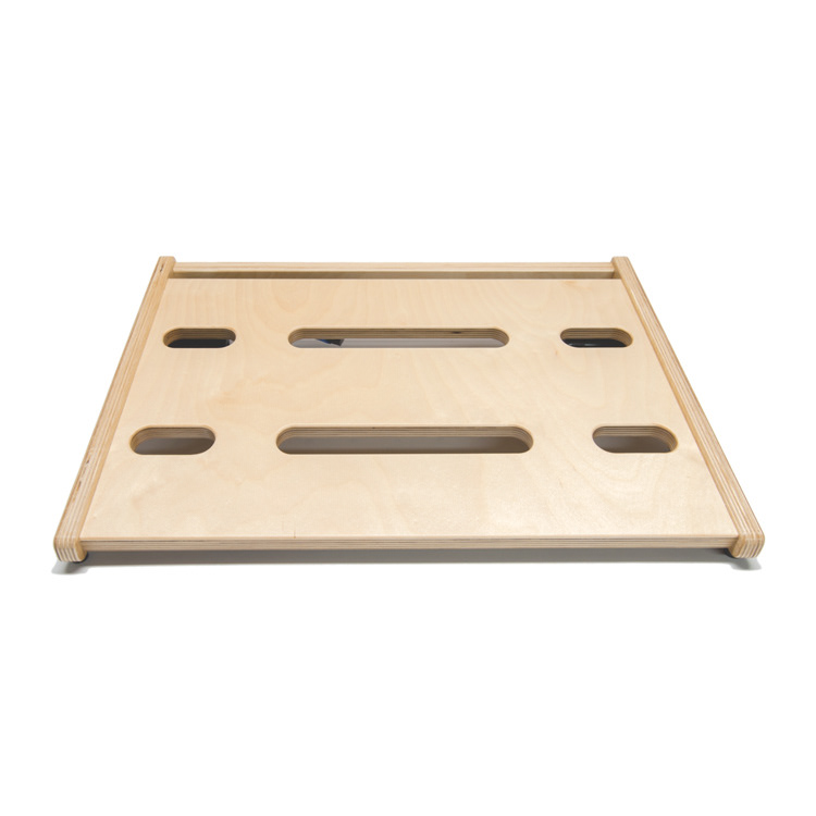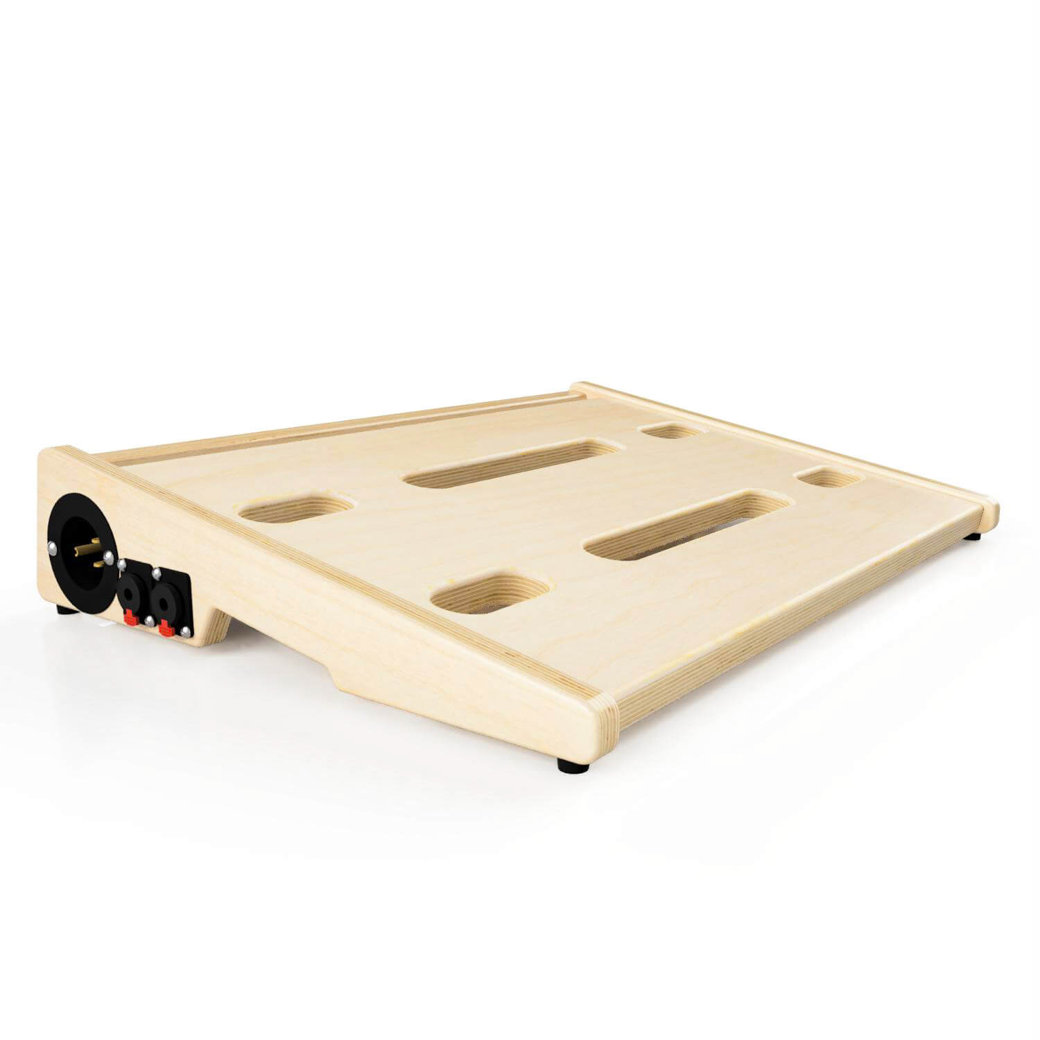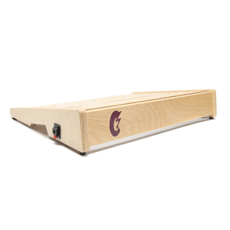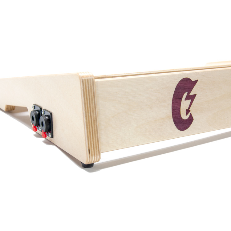 Baltic birch ply was the go to choice for this product. The qualities ply offers were perfect for this application. The over-all dimensions of this item can be customized easily to fit what the customer needs. The dimension that was the most critical was the angle at which the top of the board slopes. This is the area where the effect pedals are attached. This angle had to be comfortable and allow access to all areas of the board. The sides double as mounting locations for any number of jacks that can be requested upon ordering.