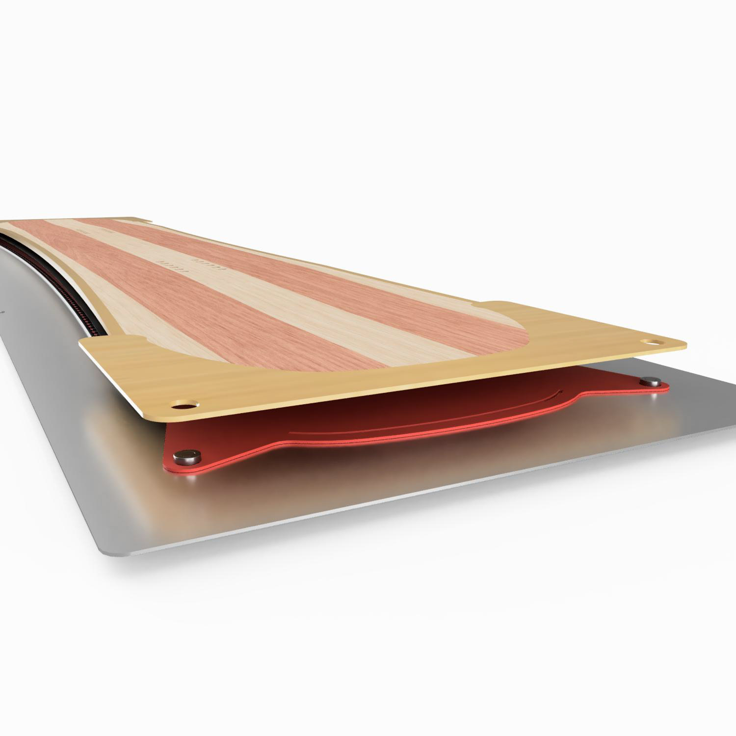 A number of ideas for the geometry, construction and materials were tried in the prototype phase. Poplar and lightweight Paulownia were chosen for the core along with Crown Plastics base and topsheet material. One area where the boards differed from the industry standard was the sidewall material, FSC certified bamboo was chosen instead of plastics. Bamboo is very strong and tough in this application with added bonding strength over similarly used plastics. Vectroply triaxial fiberglass was used with Entropy Resins to keep with the environmentally friendly goal. The geometry of the board was perfected along with the pressing and lay-up methods during the entire R&D phase.